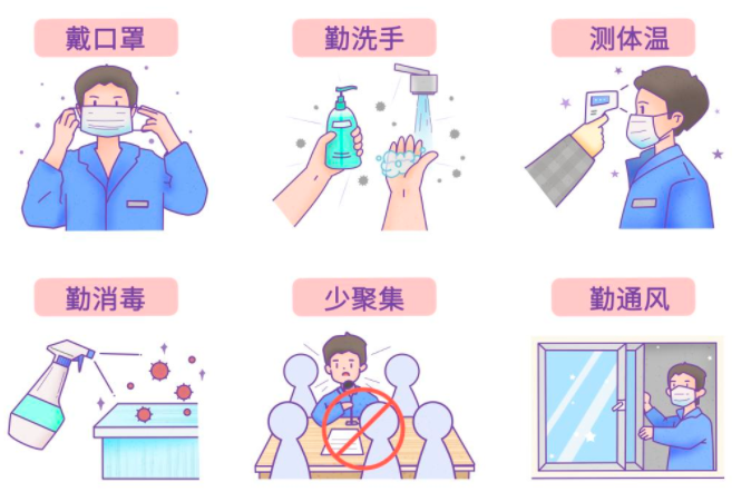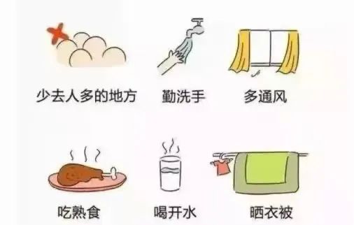 2.保持良好个人卫生和环境卫生习惯。常通风,戴口罩,勤洗手,咳嗽或喷嚏时用纸巾、毛巾等遮住口鼻。