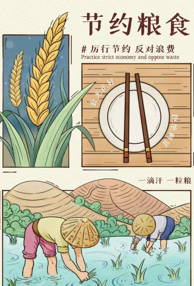 在幼儿园、家里,小朋友都要做一个“爱惜粮食”的小模范,要做到不剩饭,懂得粮食的来之不易,节约每一粒粮食,每一口饭菜。