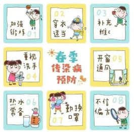 当前正值春季传染病高发期,节日期间请家长们做好各种疾病预防工作:督促孩子多喝水,饭前、便后、户外活动后用正确的方法洗手,培养孩子良好的卫生习惯,同时尽量不带孩子去人多拥挤、空气不流通的公共场所,以免感染疾病。