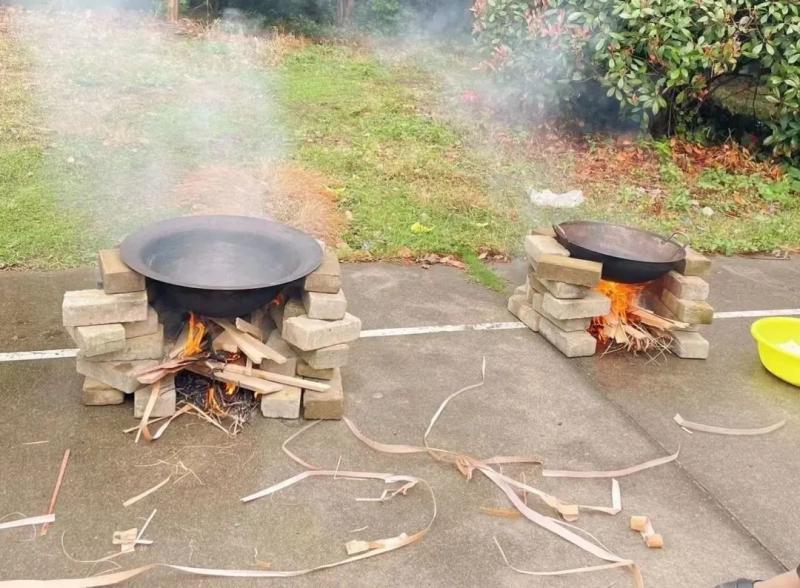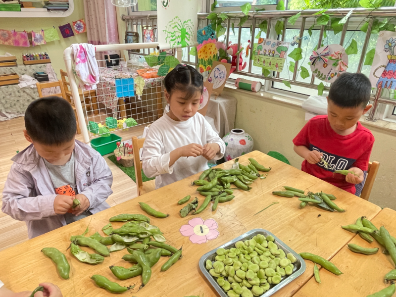 小朋友们开始忙碌起来,摘蚕豆、剥蚕豆、搭灶头、拾柴火……