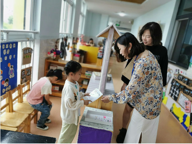 在朱雅萍园长的陪同下两位督学走进班级,观摩了幼儿自主性游戏,近距离了解幼儿的游戏情况。观摩游戏后,督学组指出班级能结合主题和幼儿的年龄特点开展区域,幼儿们能够很好的投入游戏,专注度高,同时也对班级区域创设与教师游戏指导提出了建议。